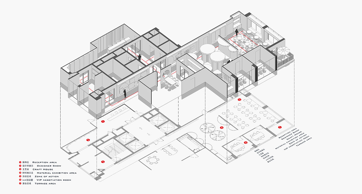 在空間色調的選擇上,我們與品牌VI結合,取自LOGO的配色,白色,黑色,紅色。白色為背景色,使空間更純粹。黑色為輔助色,主要用于一些主要交通節(jié)點的空間。使空間層次更豐富鮮明。紅色為點綴點,主要用于重點區(qū)域,起到提亮空間的作用。使空間更聚焦。